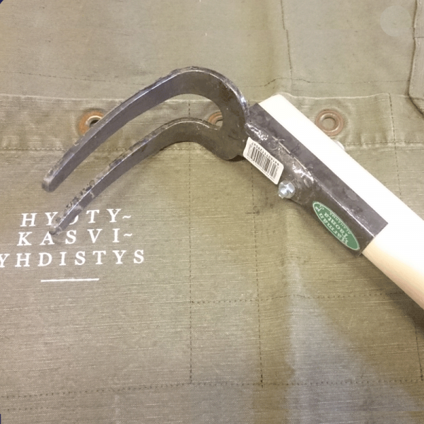 Perunakuokka, varsi käsittelemätöntä puuta. Kokonaispituus 88 cm, piikit noin 12 cm.