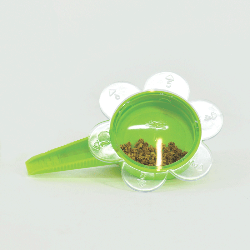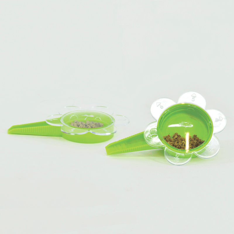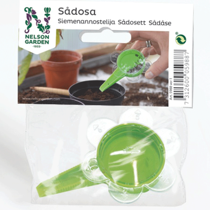 Siementen annostelijalaite, jossa on pitkä nokka ja pyöritettävässä keskiosassa kuusi eri kokoista aukkoa. Kannessa on kuusi eri kokoista aukkoa, joista valitaan sopiva ja käännetään nokan kohdalle riippuen siemenen koosta. Nokassa on rihlat, etteivät siemenet valu liian nopeasti. Koko 8 x 12 cm.