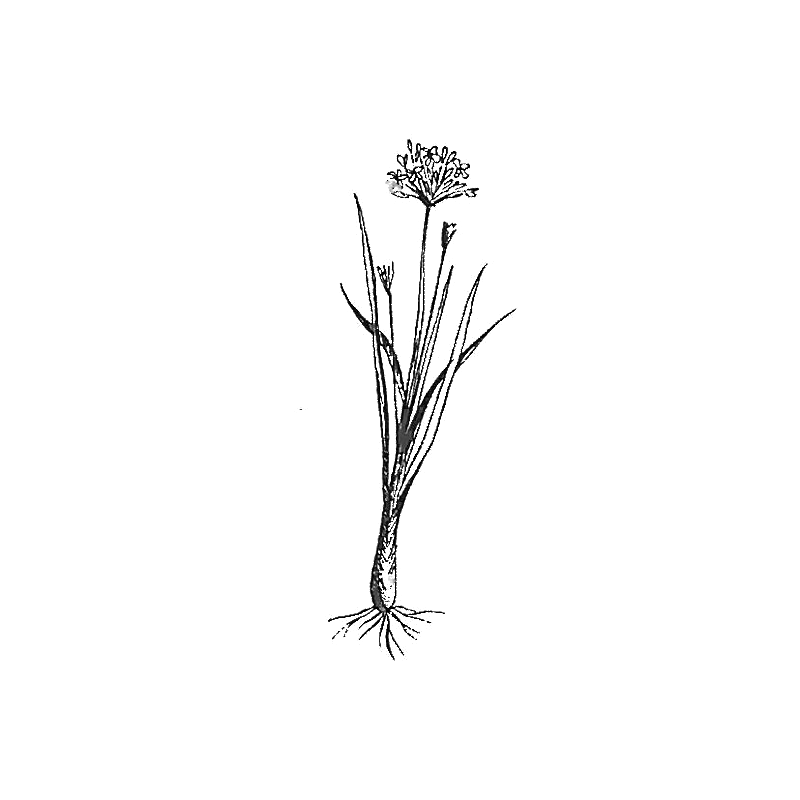 kuten ruohosipuli (I-IV). Hidaskasvuinen. Kukat valkoiset, tummanvihreät lehdet pitkänkapeat ja litteät. Verson tyveen kehittyy pieni pitkänomainen