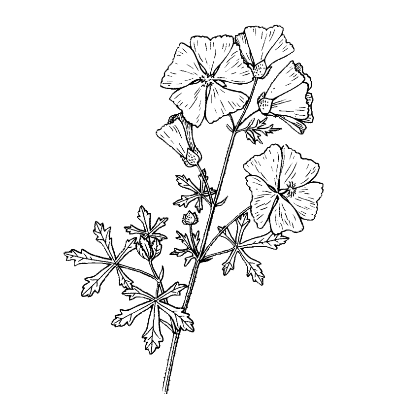 (I-IV). Kotoisin Euroopasta ja Pohjois- Afrikasta. Isoäidin kukkamaahan kuulunut pe- rinneperenna. Alhaalla munuaismaiset, ylhäällä liuskoittuneet lehdet. Kukkii kesäkuusta syyskuuhun. Tyypillinen malvakasvi. 1g = n. 450 siementä.